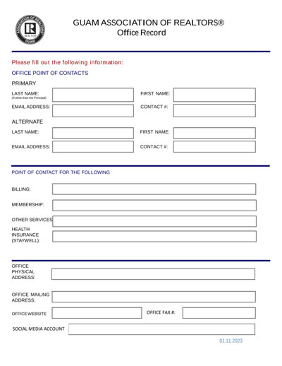 Principal Brokers / Appraisers: Complete and submit this Office Record Form to update any changes in your contact information and office POCs. Please email submissions to GAR at [email protected]